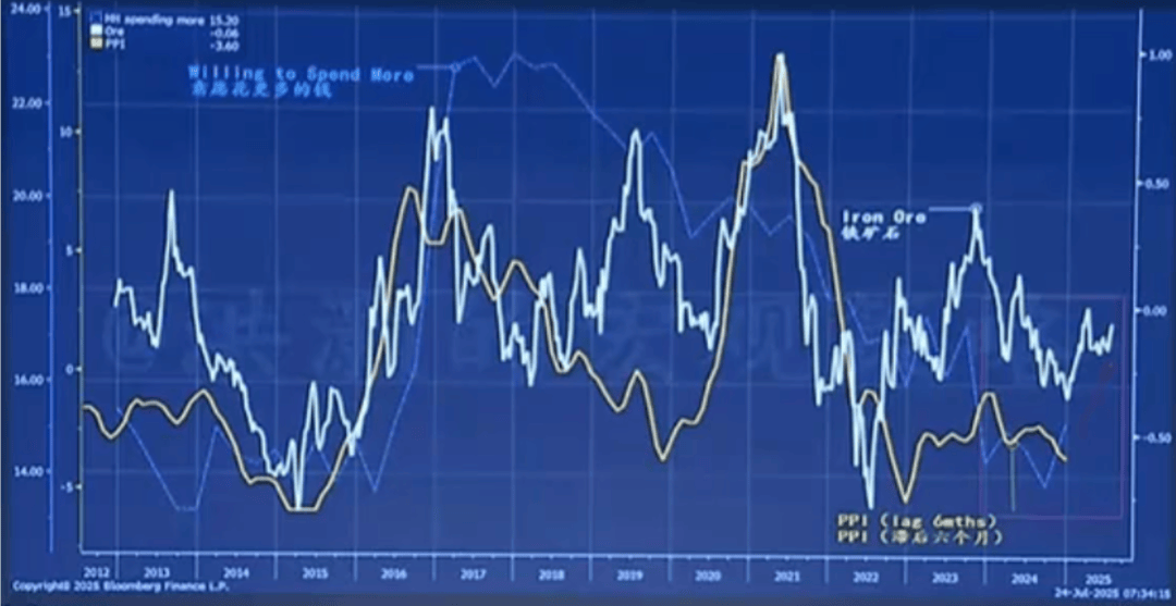 再看这个图,我们向各位展示的,是上游的通胀和黄色线PPI,以及和铁矿石之间的关系。