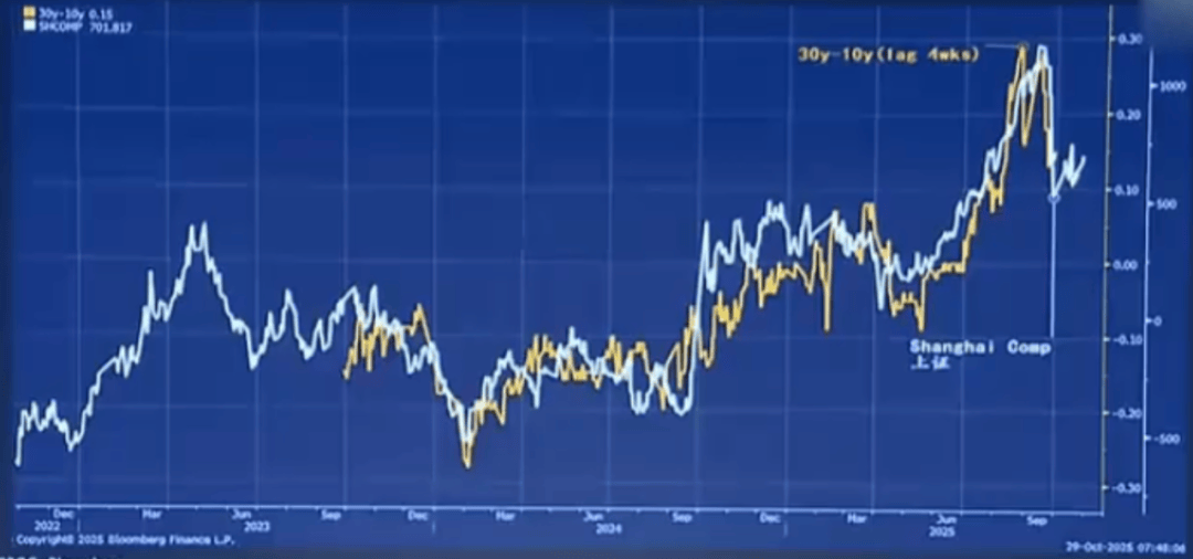 白色线是我们上证指数,黄色线是最长端的收益率曲线变化的情况。