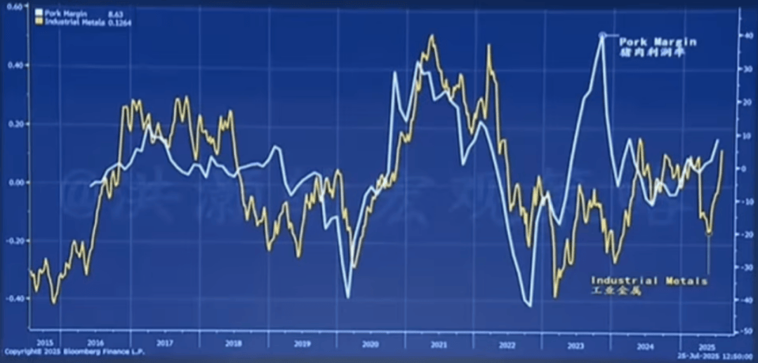这张图,向大家展示的是猪肉行业的利润率和工业金属价格之间的关系,各位看一下,基本上是同涨同跌的。
