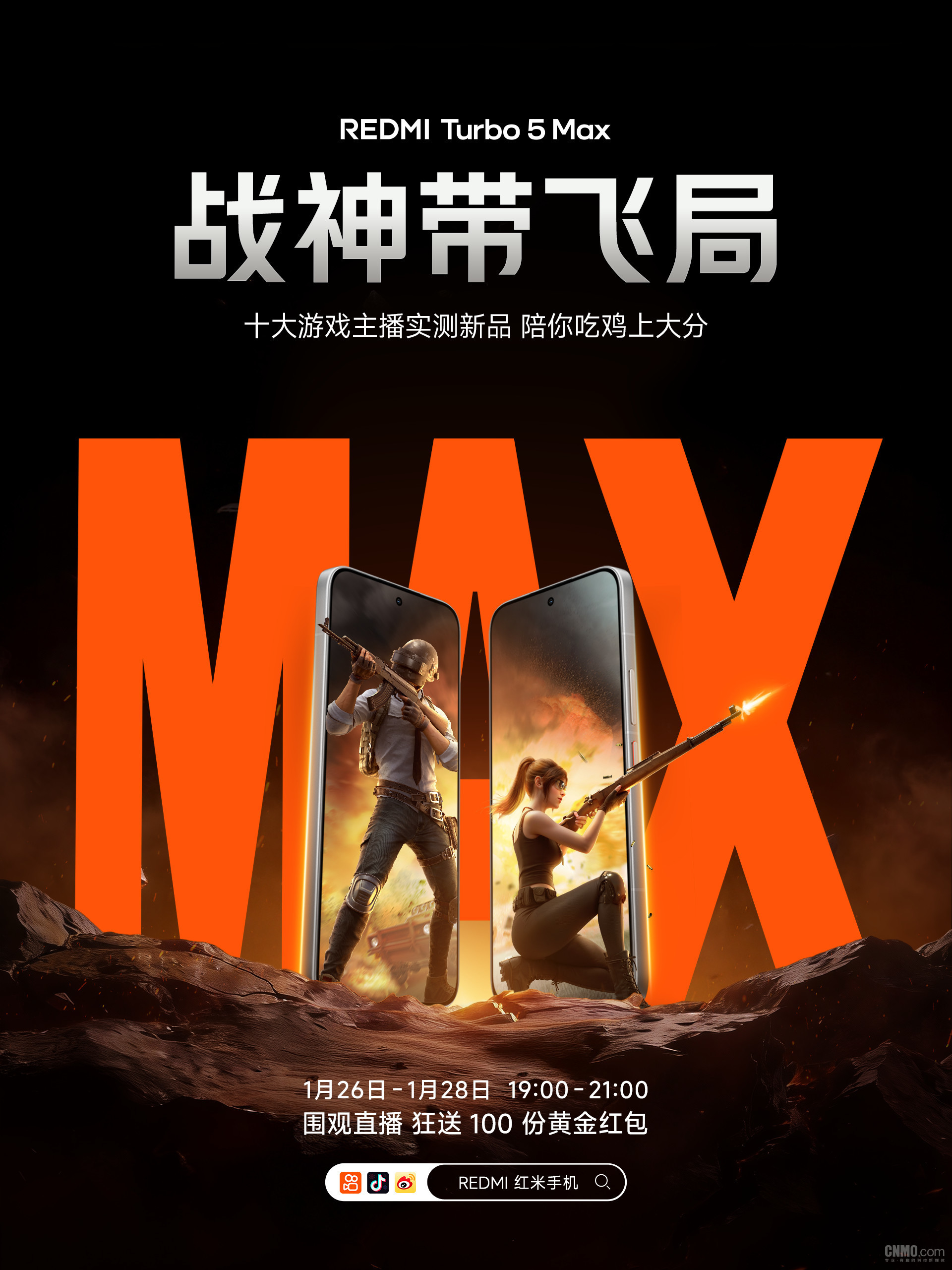 【CNMO科技消息】1月25日配资指数平台,REDMI红米手机官方宣布:明日开战!REDMI Turbo 5 Max “战神带飞局”,十大游戏主播连续三天(1月26日-28日)实测新品。